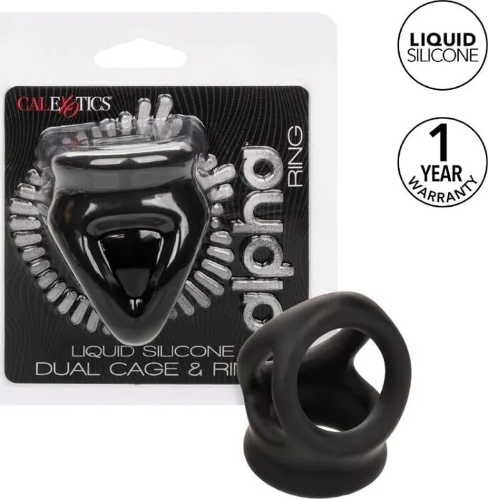 Aumenta a resistência e a sensibilidade com o Anel de Gaiola Dupla Alpha da CALEXOTICS. Este anel elástico e luxuoso, feito de silicone líquido, oferece uma sensação suave e duradoura, recomendável para um desempenho otimizado. O design inovador inclui um suporte seguro para o escroto, garantindo maior conforto e segurança durante o uso.