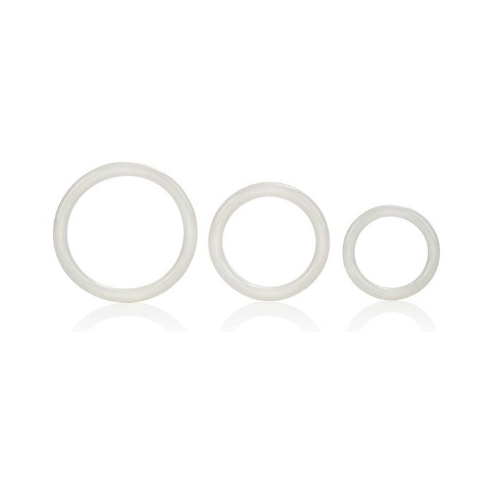 Conjunto de três anéis sem vibração em silicone muito flexível que ajudam a manter ereções mais firmes e a controlar a ejaculação precoce. Cada anel tem um diâmetro distinto para que possas ajustar a compressão progressivamente; brilham no escuro para uso descontraído. Recomendado para quem procura uma solução simples, discreta e segura — usa apenas lubrificante à base de água.