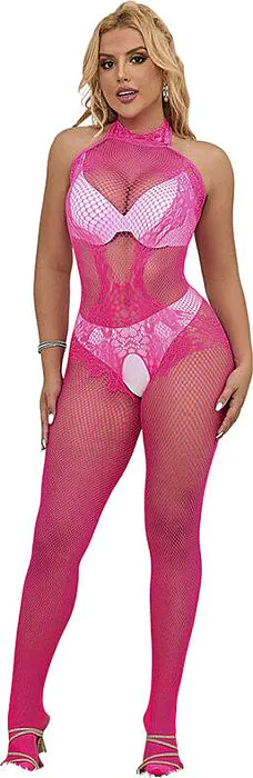 Este bodystocking de encaje rosa combina elegancia y seducción. Su diseño ceñido y elástico es indicado para ocasiones especiales, perfectas para realzar tu belleza.