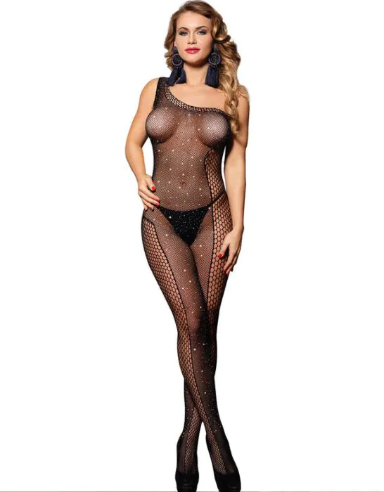 Este bodystocking de um ombro só combina elegância e sensualidade. Feito em rejilla negra com diamantes, adapta-se a diferentes tipos de corpo, indicado para ocasiões especiais.