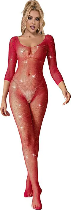 Realça as tuas curvas com este bodystocking que proporciona um ajuste ceñido e conforto, indicado para quem quer sentir-se sexy. O design de rejilla com diamantes em vermelho vibrante confere um toque elegante e moderno, recomendável para ocasiões especiais.