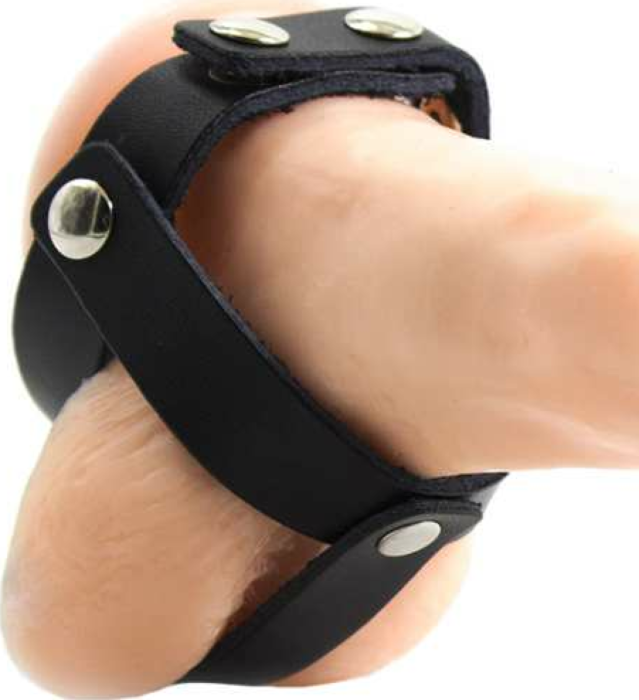 Funda de couro para testículos que proporciona conforto e segurança. Indicado para quem aprecia acessórios fetichistas de qualidade e ajustáveis.