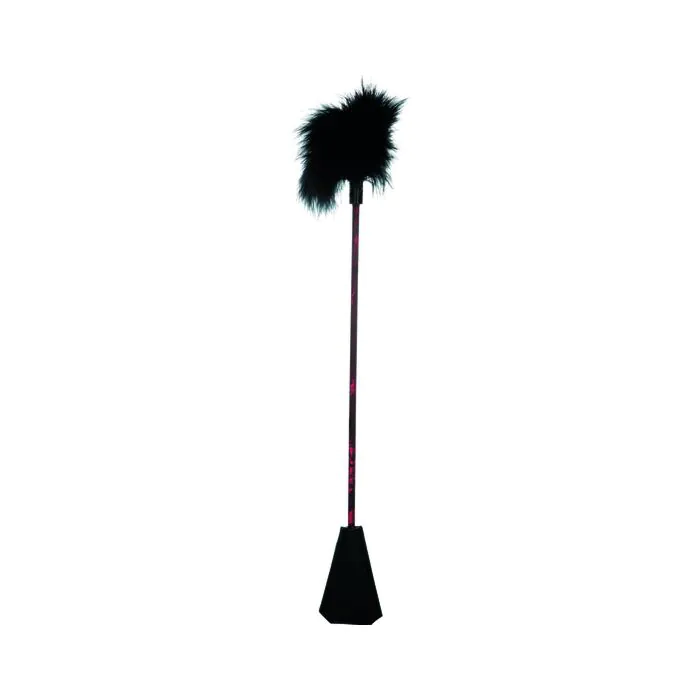 Elegante fusta de piel cosida a mano con plumas en un extremo.