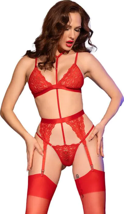 Este conjunto CR 4713 é um conjunto de lingerie de quatro peças que junta renda elástica e detalhes provocadores — ideal se queres algo com presença e fácil de ajustar. O soutien tem fecho regulável nas costas e a renda com elastano acompanha as formas do corpo, enquanto o tanga traz um cordão que passa pelo pescoço, acrescentando um detalhe visual marcante. As meias são do tipo cabaret, pensadas para complementar o conjunto.