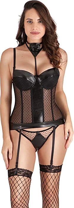 Conjunto de lingerie em talla única que reúne bustier com aros e ligueiro, tanga, acessório de pescoço removível e meias de rede. Para quem procura um look atrevido e fácil de vestir — oferece suporte ajustável graças aos aros e às alças reguláveis, mantendo um acabamento semitransparente com padrão de lunares e detalhes em couro preto.