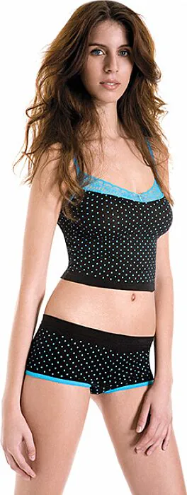 O conjunto de lingerie oferece um toque de sensualidade e conforto, com um top que destaca o escote e um short com um divertido design de topos. Feito para quem aprecia a combinação recomendável entre estilo e conforto.