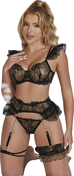 Composto por um sujetador de encaje floral translúcido e um panty a condizer, este conjunto é indicado para ocasiões românticas ou para te sentires potente em qualquer momento. O sujetador possui tirantes ajustáveis e um corte que proporciona suporte sem comprometer a sensualidade. O liguero, com detalhes de encaje, permite prender as tuas meias favoritas, acrescentando um toque de sedução. O panty complementa a peça com um design coqueto e confortável.