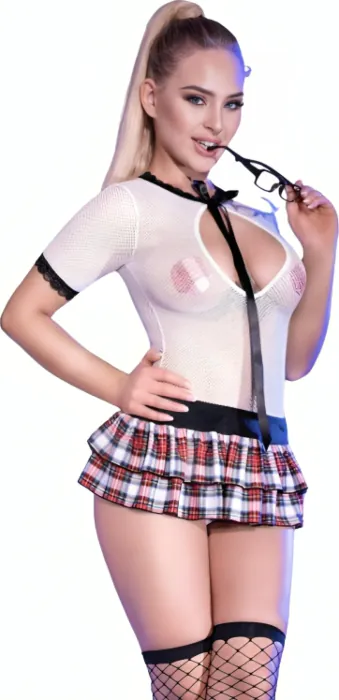 Um conjunto de colegiala sedutor que combina um body provocativo e uma saia curta para um visual ousado e divertido. O body confeccionado em suave malla branca realça a figura, enquanto a saia com padrão de quadros escoceses traz um toque de picardia. Complementado por gafas e outros acessórios, este traje é perfeito para eventos especiais ou para apimentar a intimidade.