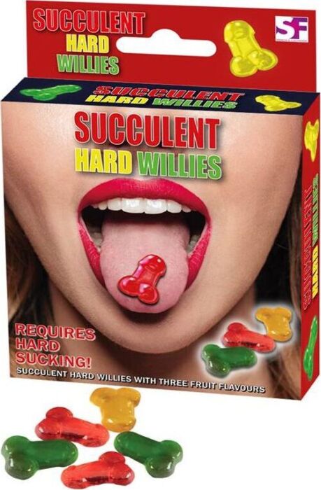 Guloseimas duras com forma de pene, disponíveis em três sabores de frutas. Perfeitas para partilhar em festas ou como presente divertido.
