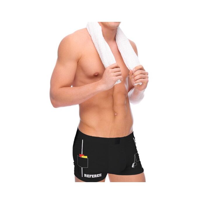 ¡Estos graciosos bóxers son la monda! Son de talla única y algodón 100., por lo que siempre quedan perfectos. Estos bóxers son de color negro de apariencia de árbitro y llevan escrito Referee.