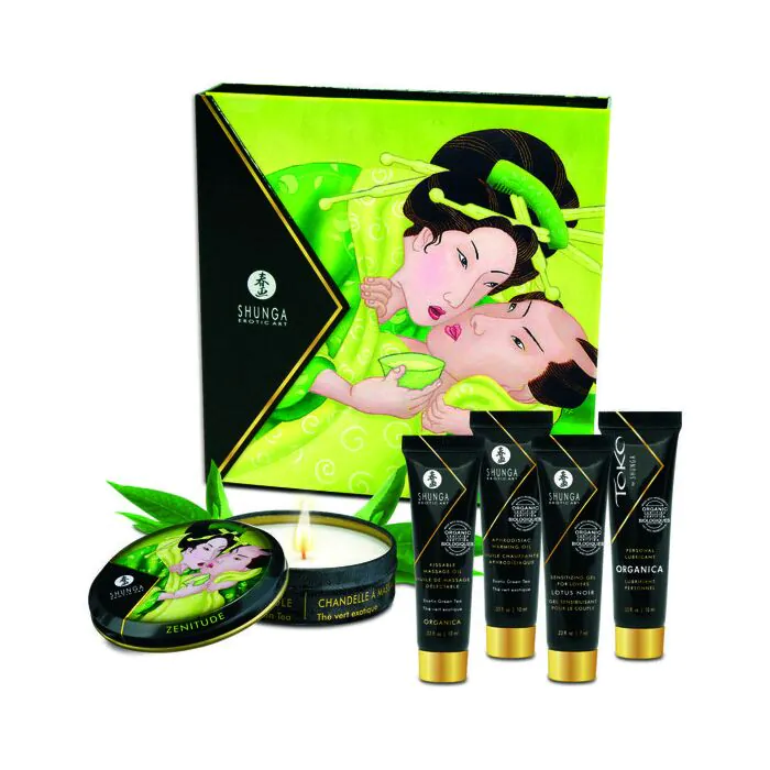 Deixe-se seduzir pela sensualidade e pelo mistério da coleção "Segredos de uma Gueixa Chá Verde" da Shunga! Este kit requintado de cosmética erótica convida-o a explorar os prazeres mais íntimos e sensuais em casal, combinando aromas e sabores afrodisíacos para estimular todos os seus sentidos.