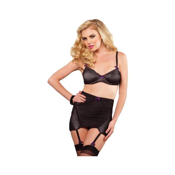 3Pz. Este conjunto de tres piezas incluye un sujetador en spandex con aros cubierto de gasa con lunares, una minifalda liguero con cierre de corsé con corchetes en la parte trasera y un tanga a juego.