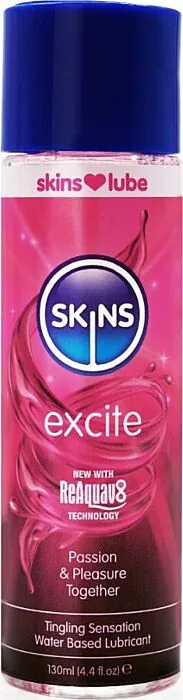 Skins Excite é um lubrificante à base de água concebido para acrescentar estímulo ao contacto íntimo: a L-arginina favorece o fluxo sanguíneo local e os extratos de trevo-vermelho e ginkgo trazem uma sensação de formigueiro leve que realça a excitação. A textura cristalina não mancha e a fórmula ReAquav8 permite reactivar o produto com apenas algumas gotas de água quando começar a secar.