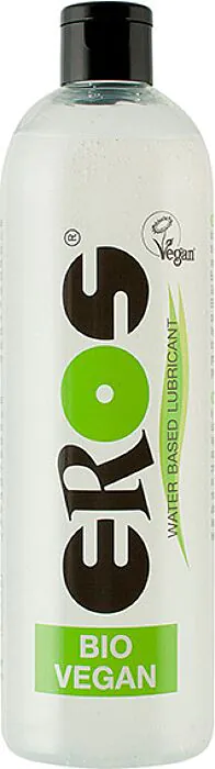 Lubrificante à base de água Eros Bio & Vegan Aqua em frasco de 500 ml. Feito para quem prefere ingredientes naturais e uma lubrificação duradoura sem perfumes nem óleos. Excelente para uso com preservativos de látex e brinquedos eróticos; fácil de limpar e adequado para quem valoriza produtos vegan e registados na Vegan Society.