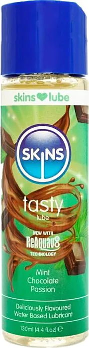 Lubrificante à base de água SKINS com sabor menta & chocolate e 130 ml. Fórmula suave, vegana e não mancha; pensado para quem quer adicionar um toque de sabor ao prazer íntimo. A tecnologia Reaquav8 permite reativar o produto com um toque de água ou um ligeiro lamido, útil durante sessões orais e partidas prolongadas. Compatível com preservativos e brinquedos eróticos.