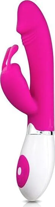 Vibrador elegante com conejito estimulador que oferece 30 modos de vibração. Indicado para quem procura prazer clitoriano e interno. Não inclui pilhas.