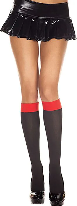 Meia lisa e opaca da Music Legs em preto e vermelho. Uma peça simples e versátil para acrescentar cor ao teu look ou lingerie, sem transparências. Boa opção para quem procura um acabamento liso e fácil de combinar; não serve se procuras padrões rendados ou tecido translúcido.