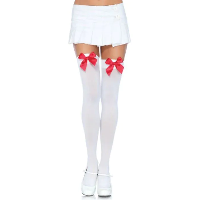 Atreva-se a experimentar e seduzir com as Meias de Nylon Leg Avenue em branco com laço vermelho. Adquira as suas agora e adicione um toque de travessura e sofisticação ao seu estilo!