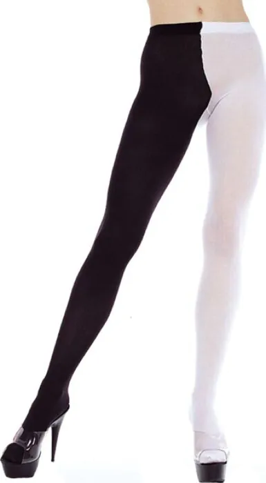 Meias panty opacas da Music Legs em tamanho XXL com uma perna preta e outra branca — um detalhe bicolor que adiciona personalidade sem perder a sobriedade. Acabamento liso, boa cobertura e corte pensado para quem procura conforto numa peça statement. Não serve quem procura transparência ou outros tamanhos.