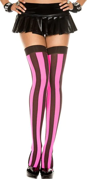 Meias de efeito visual marcante da Music Legs: riscas verticais em combinação de preto e rosa que valorizam a silhueta. Perfeitas para quem quer um apontamento feminino e arrojado na roupa sem perder subtileza. Recomendadas para saídas, festas ou para dar personalidade a um look diário na nossa loja erótica online.