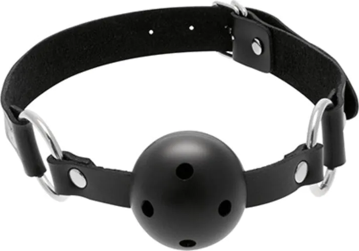 Esta mordaça de bola foi pensada para quem pratica BDSM e valoriza conforto e segurança: a bola tem aberturas que permitem respirar sem incómodos, enquanto os aros metálicos ligam a bola a uma tira de couro com fivela que se regula conforme o tamanho da cabeça. A combinação de goma, ABS, metal e couro oferece sensação macia na bola com estrutura rígida onde é necessário.