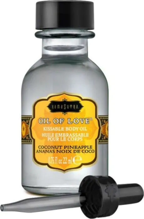 Óleo kissable KAMASUTRA com sabor a coco e abacaxi, formulado à base de água para beijos e preliminares. Proporciona uma leve sensação de calor na pele, não mancha e traz aplicador para uso localizado. Indicado para quem quer adicionar sabor e jogo erótico sem usar um óleo de massagem ou lubrificante tradicional.