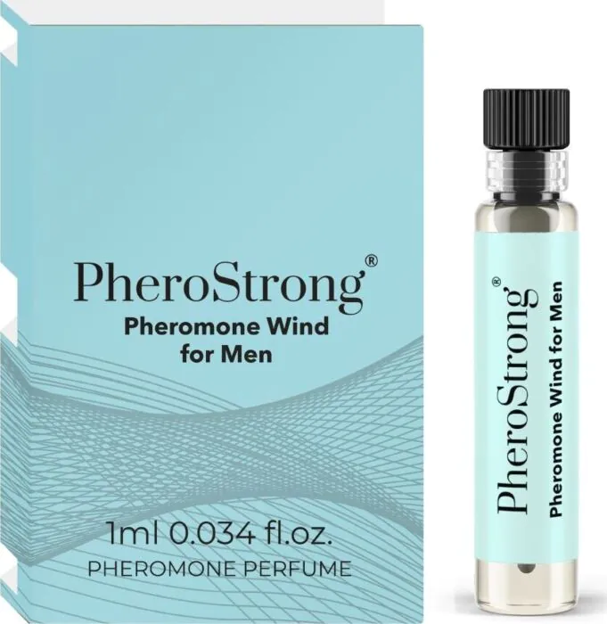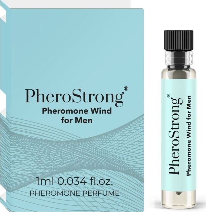 Pherostrong Wind é uma fragância que combina notas de angélica, bergamota e pachulí, intensificada com feromonas para aumentar a confiança e atratividade.