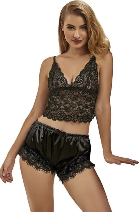 O conjunto é composto por seda e renda, proporcionando um toque macio e um aspecto sofisticado.