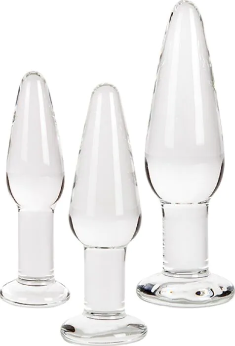Pack de 3 plugs em vidro transparente pensado para quem quer começar na penetração anal com progressão controlada. Ponta cónica e base plana para inserção mais fácil e agarre seguro; o vidro permite também brincar com a temperatura. Um brinquedo erótico discreto, fácil de limpar e compatível com lubrificantes à base de água ou silicone.