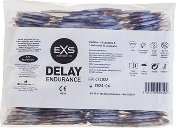 Pack grande de preservativos retardantes Exs Endurance Delay: 1% de lidocaína no interior para ajudar a controlar a ejaculação, látex natural com lubrificante de silicone no exterior e ajuste confortável. Perfeito se procuras redução de sensibilidade sem sacrificar a sensação de segurança. Não serve para quem tem alergia a látex ou a anestésicos locais.