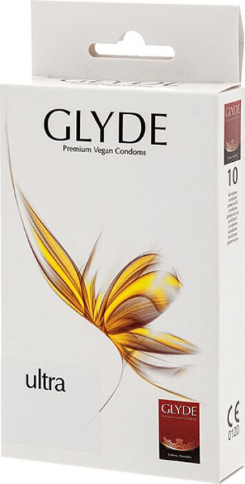 A caixa contém 10 unidades de preservativos Glyde Ultra, garantindo uma proteção segura para várias ocasiões.