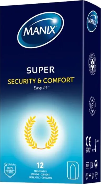 Aqui tens os Manix Super: um conjunto de preservativos clássicos em látex natural concebidos para uso corrente. Em loja dir-te-ia que são a escolha para quem quer algo fiável, confortável e sem surpresas — ajuste preciso graças à largura nominal de 52 mm, forma cilíndrica com reservatório e lubrificação pronta a usar. São transparentes, testados eletronicamente e vêm numa caixa de 12 unidades, o que facilita ter sempre um par à mão.