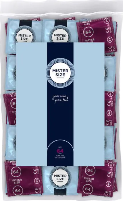 Os preservativos MISTER SIZE têm um largura nominal de 64 mm, projetados para conforto e segurança durante o uso.