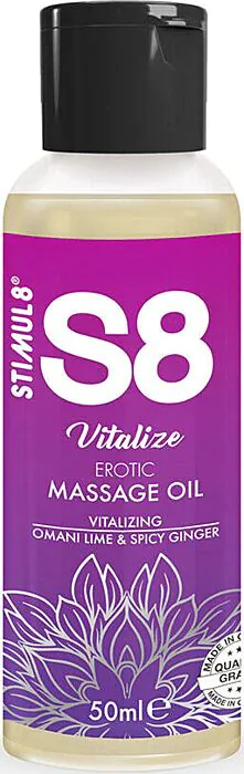 Óleo de massagem erótico S8 Vitalize em frasco de 50 ml, com aroma de lima e gengibre. Combina óleo de jojoba, amêndoas e sésamo para hidratar e deixar a pele macia. Perfeito para casais que procuram um óleo nutritivo e aromático em formato de viagem; não é indicado para uso com preservativos de látex nem para lubrificação íntima prolongada em brinquedos de silicone.