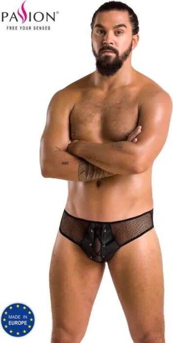 Slip masculino PASSION MEN Richard em S/M pensado para quem procura uma peça com acabamento moderno e produção europeia. Tecido com acabamento em poliuretano para um visual mais marcante e ajuste confortável. Excelente escolha se queres uma peça para ocasiões especiais ou para realçar a tua silhueta com qualidade certificada pela UE.