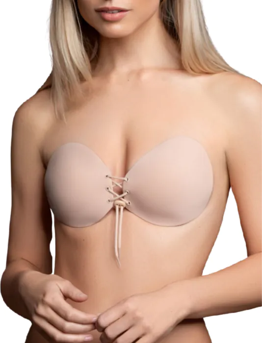 O sujetador adesivo Bye Bra proporciona suporte sem alças, recomendável para roupas sem costas. O fecho frontal ajusta o decote para um efeito visual encantador.