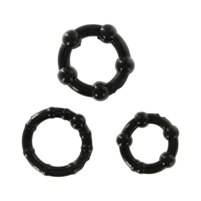 Os três anéis de silicone em preto de diferentes tamanhos incluídos neste conjunto adaptam-se perfeitamente a qualquer tamanho de pénis, garantindo um ajuste confortável e seguro para potenciar o teu desempenho sexual. Já imaginaste poder manter a tua ereção por mais tempo e desfrutar de relações mais intensas e prazerosas? Com este conjunto de anéis, agora é possível!