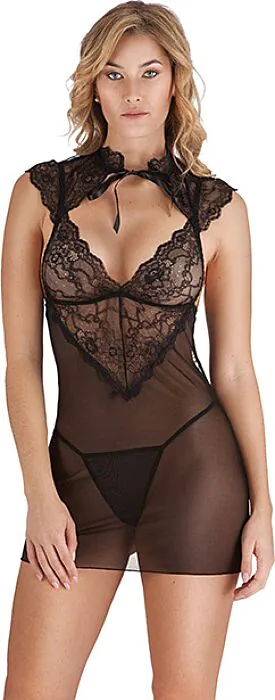 Uma combinação sedutora de transparências e rendas florais, este vestido curto traz conforto e um toque de elegância. Confeccionado em 97% nylon e 3% elastano, garantirá que te sintas sexy e confiante. O design inclui tirantes ajustáveis e um laço no pescoço, realçando ainda mais o escote.
