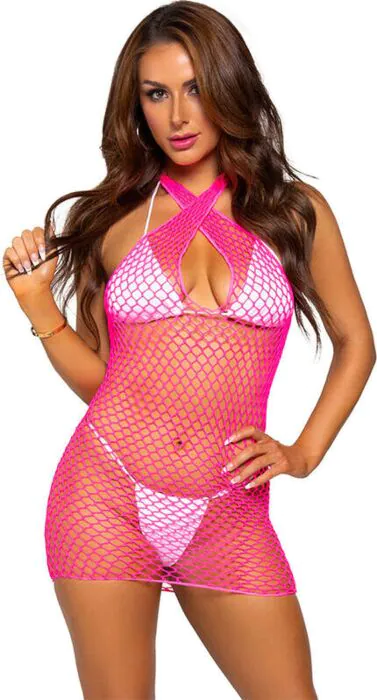 Minivestido em rede fucsia que acentua as curvas naturais. Confortável e elástico, ideal para quem deseja ousar nas noites de festa.