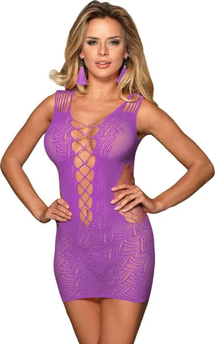 Este vestido curto de rejilla morado é a escolha indicado para quem deseja um look sedutor e sofisticado em ocasiões especiais. A sua elasticidade e design particular adaptam-se a diversas formas corporais, garantindo conforto e confiança.