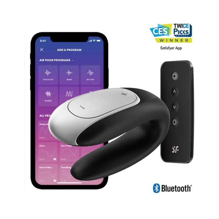 Também possui um controlo intuitivo: Os diferentes programas de vibração podem ser controlados através dos botões de controlo do próprio vibrador para casais, com o controlo remoto sem fios incluído ou através da aplicação Satisfyer Connect.