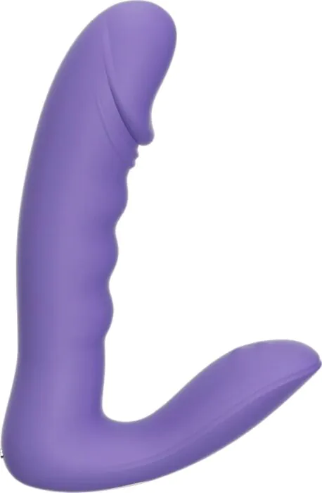 RORA é um vibrador duplo em silicone pensado para quem quer estimulação focalizada da zona G e, ao mesmo tempo, clitoriana — e que valoriza controlo e versatilidade. Tem um eixo rígido com ponta em forma de glande curvada para direcionar bem a estimulação, e uma peça externa com base larga que serve de apoio: isso permite colocá-lo contra a vulva ou o períneo para uso mãos-livres. Além da vibração, acrescenta uma função de movimento que intensifica a sensação. O acabamento é lavanda púrpura suave ao toque.